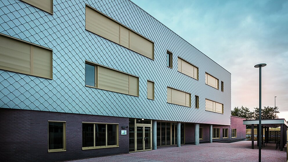 Rozwiązaniem okazało się połączenie dwóch materiałów: brązowej klinkierowej okładziny w części podstawy budynku oraz srebrzystej aluminiowej fasady na wyższych kondygnacjach. Takie dwuczęściowe rozwiązanie nadaje budynkowi elegancji, a jednocześnie charakteryzuje się trwałością i praktycznością. Około 15 000 rombów elewacyjnych PREFA 29 × 29 w kolorze srebrnym metalik tworzy zewnętrzną powłokę. To ponad 1375 metrów kwadratowych aluminium, które zostało zaprojektowane, wyprodukowane i zamontowane. Zmieniający się metal tworzy żywą powierzchnię, która w zależności od oświetlenia mieni się różnymi kolorami nieba.