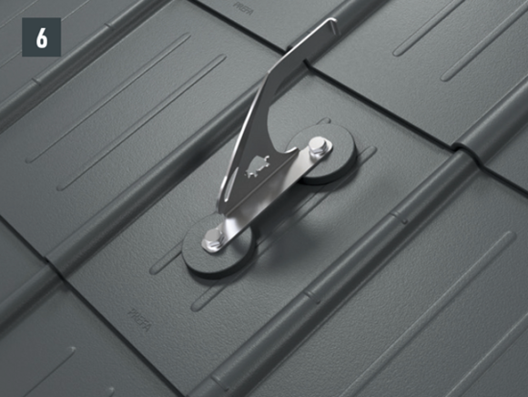 Należy przestrzegać wytycznych montażowych PREFA, obowiązujących norm oraz regulacji branżowych. Dachowe haki bezpieczeństwa montuje się na środku krokwi przy użyciu dołączonych wkrętów.