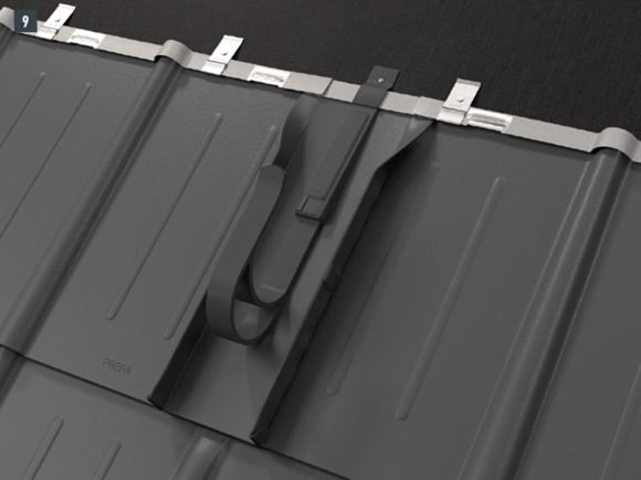 Warunki wstępne fachowego/poprawnego montażu to system dachowy PREFA zamontowany zgodnie z obowiązującymi normami/regulacjami branżowymi oraz konstrukcja nośna o dostatecznej nośności statycznej (krokwie min. 8/8 cm i pełne deskowanie o grubości min. 24 mm, przy izolacji nadkrokwiowej min. 10 × 14 cm). |