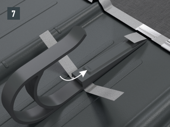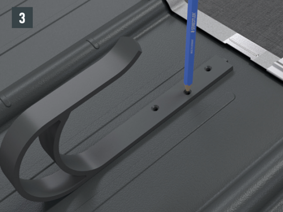 W przypadku wszystkich systemów dachowych PREFA konieczne może być zamontowanie blachy podkładowej (np. jeśli w obszarze powierzchni montażowej znajduje się rąbek lub grzbiet fali). Nie osadzać wspornika ławy kominiarskiej na rąbku ani grzbiecie fali pokrycia dachowego PREFA ani nie mocować go w tych punktach.