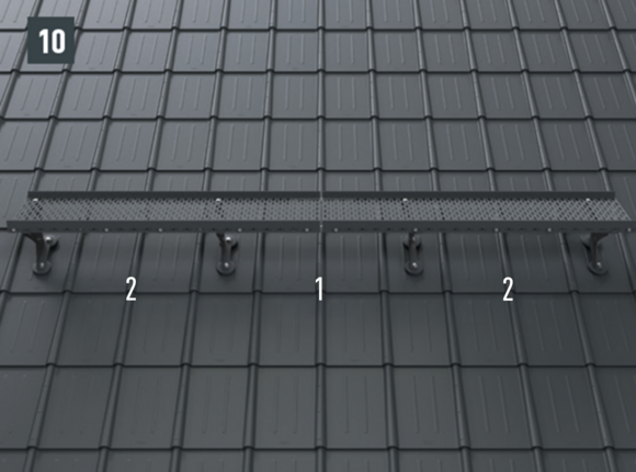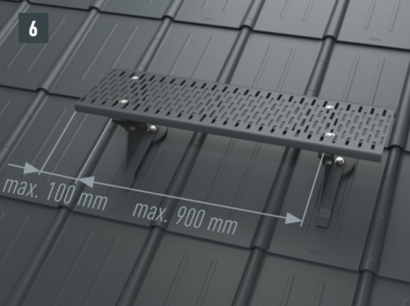 Warunki wstępne to system dachowy PREFA zamontowany zgodnie z obowiązującymi normami/regulacjami branżowymi, na pełnym deskowaniu o grubości min. 24 mm oraz konstrukcja nośna o dostatecznej nośności statycznej. Rozstaw krokwi może wynosić maks. 1000 mm. Wsporniki ławy kominiarskiej należy zamontować na dołączonych podstawach do deskowania. |