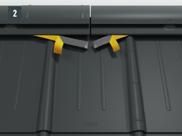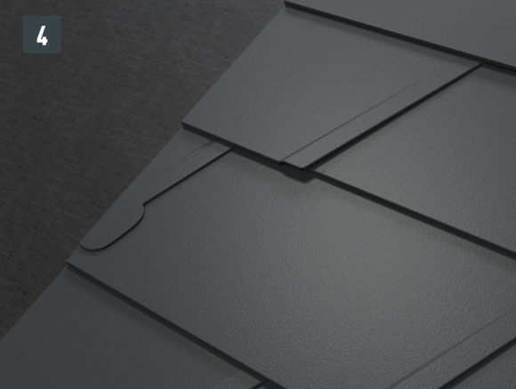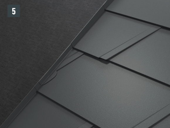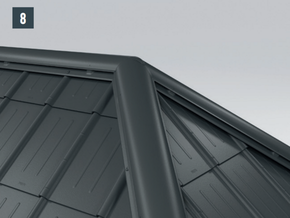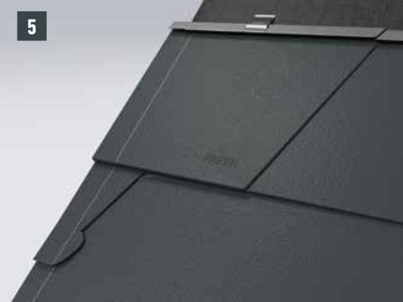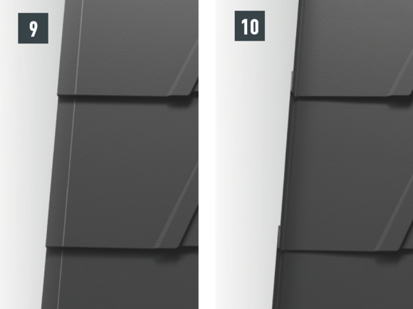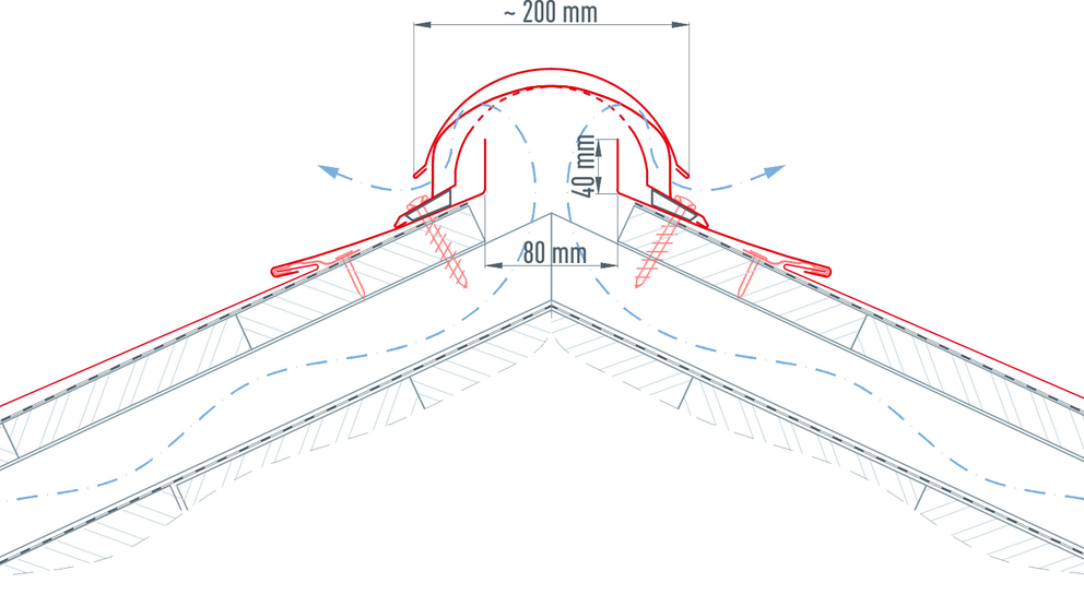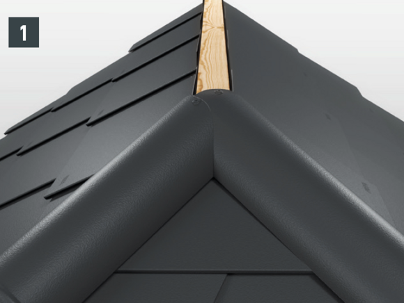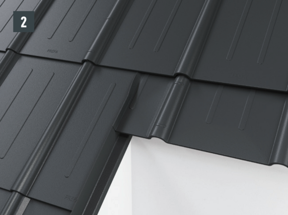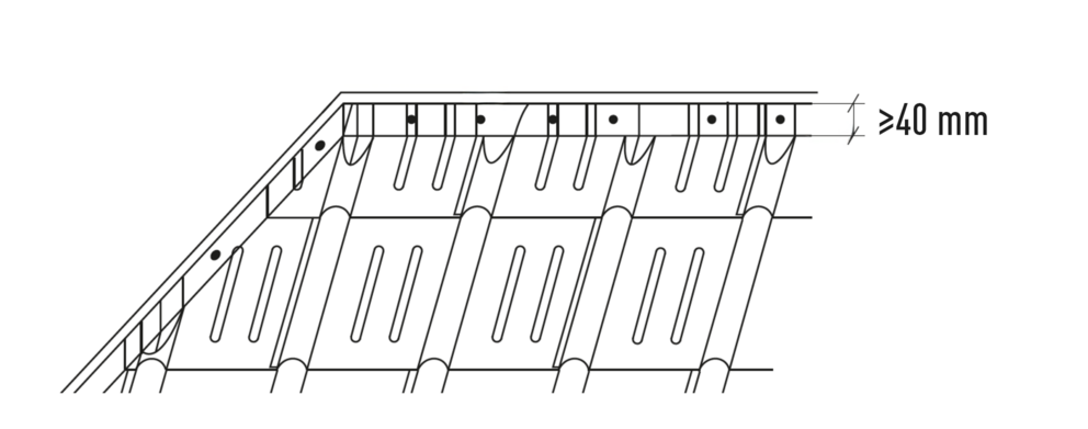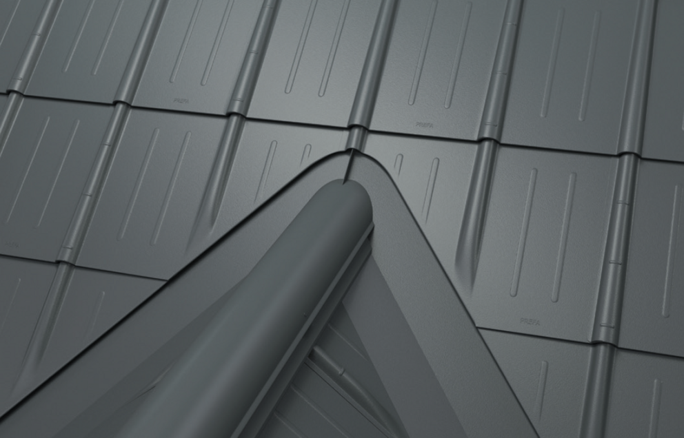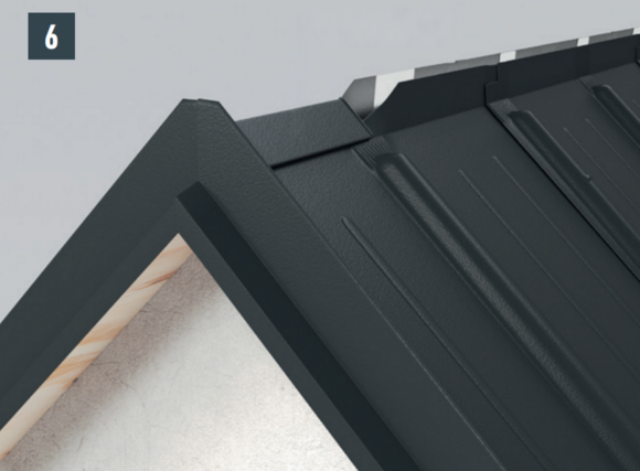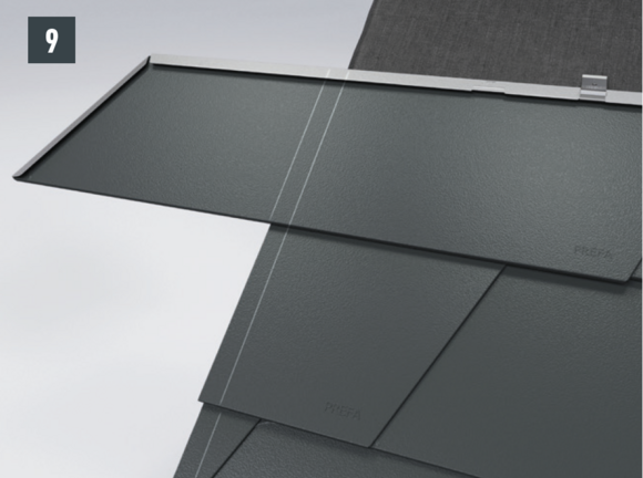 Warunkiem szczelności dachu przed śniegiem jest dociągnięcie elementów pokrycia PREFA w strefie naroża i kalenicy min. 40 mm do góry.