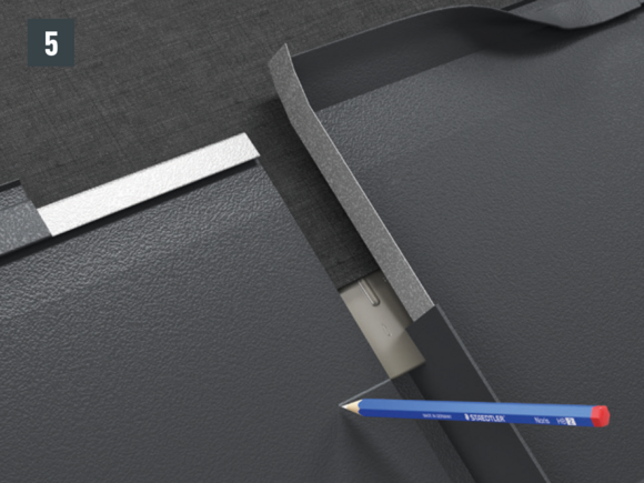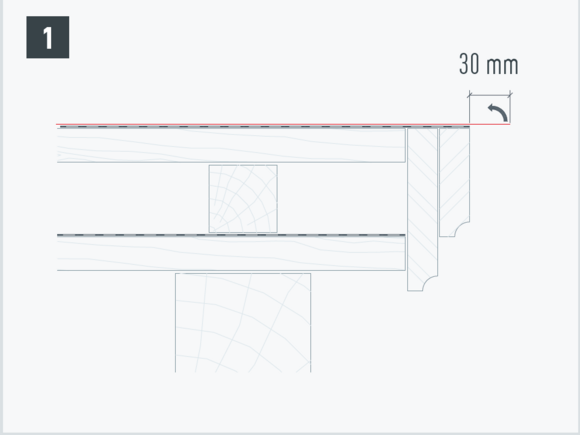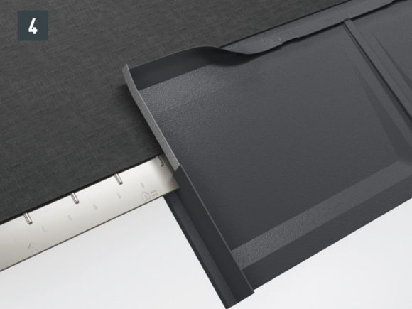 W obszarze zaginanej krawędzi wyprofiluj górny rąbek systemowy tak, aby nie naruszyć rąbka leżącego (rys. 1 i 2), i wygnij 30 mm dachówki R.16 lub panelu dachowego FX.12 w górę pod kątem prostym do połaci dachu.