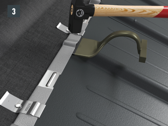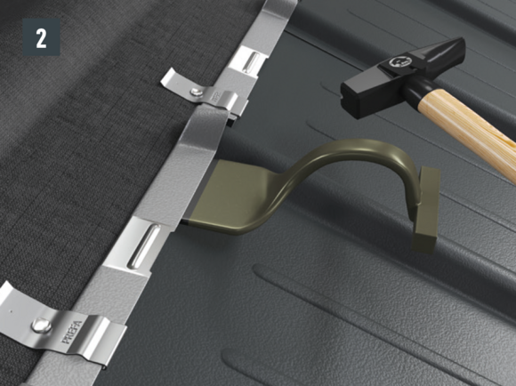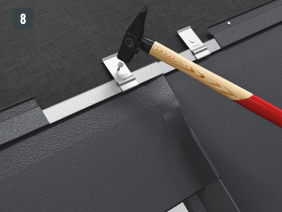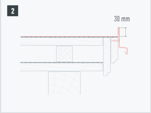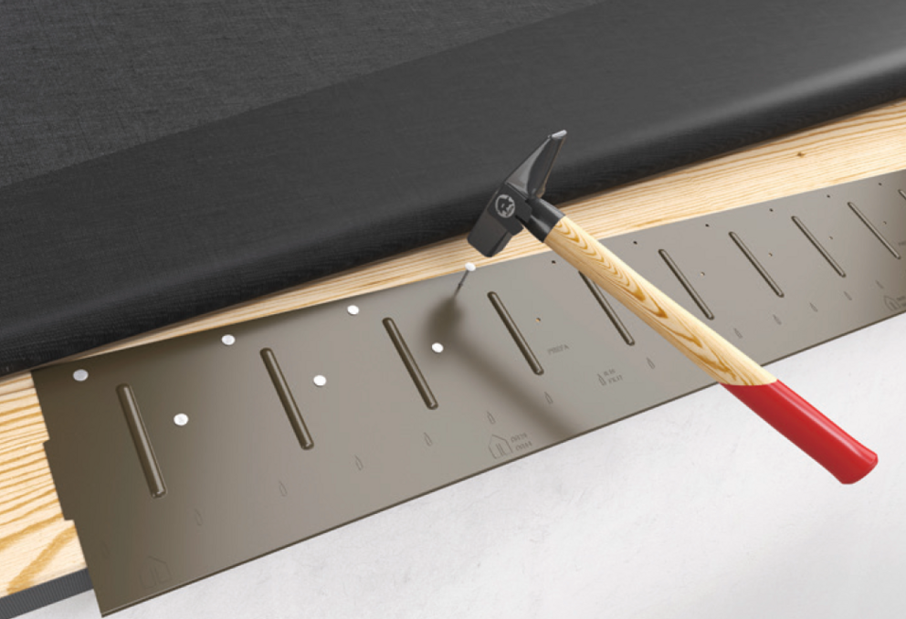 Pas startowy musi zostać zamocowany tak, aby był odporny na działanie wiatru (należy wykorzystać wszystkie fabrycznie wytłoczone otwory). Do momentu wbicia dołączonych gwoździ PREFA we wszystkie przebite fabrycznie otwory pas startowy musi pozostawać zamocowany do okapu w inny sposób.