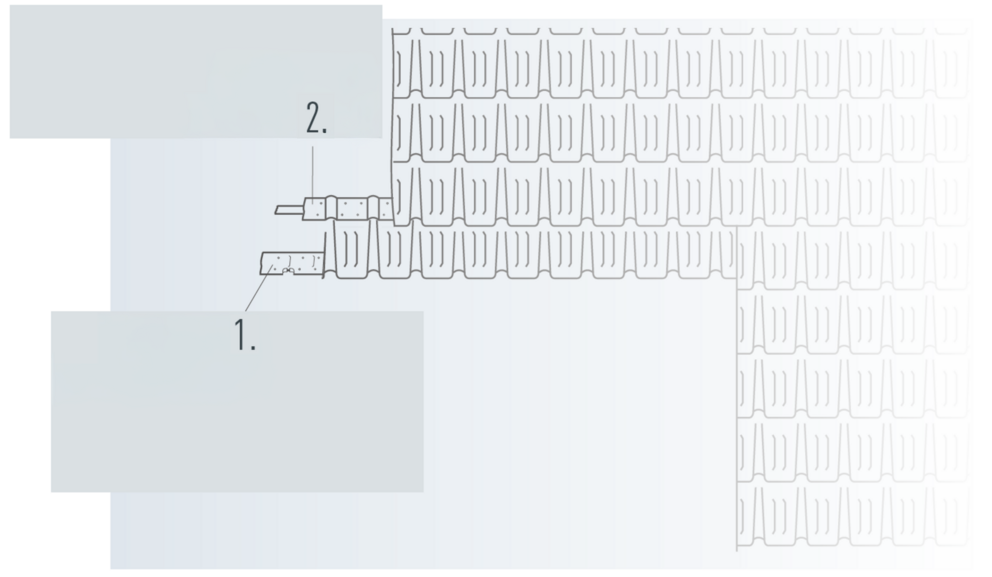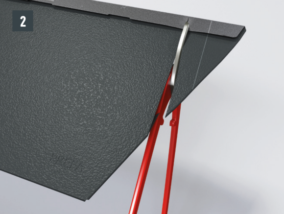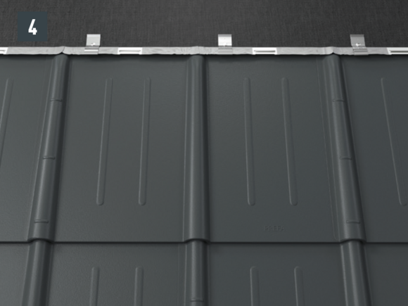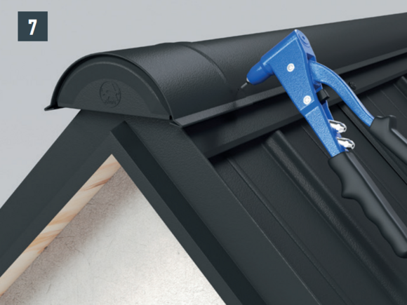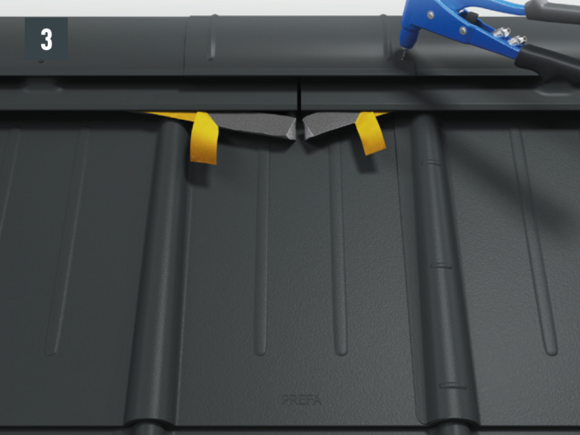 Ostatni (w razie potrzeby przycięty) rząd dachówek przymocuj zaczepem zwrotnym bezpośrednio z boku grzbietu fali, która znajduje się poniżej (w przypadku dachówek klasycznych PREFA), lub bezpośrednio powyżej piankowego klina gąsiora wentylowanego.