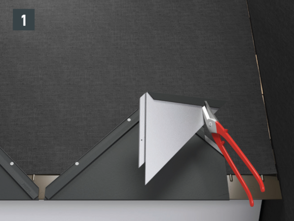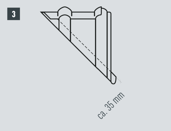 W przypadku każdego bocznego zagięcia dachówki romb 44 × 44 (wiatrownica i kołnierz) biegnące ukośnie do dołu rąbki muszą zostać wycięte na spodzie i wygięte.