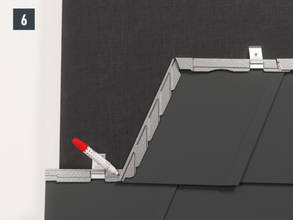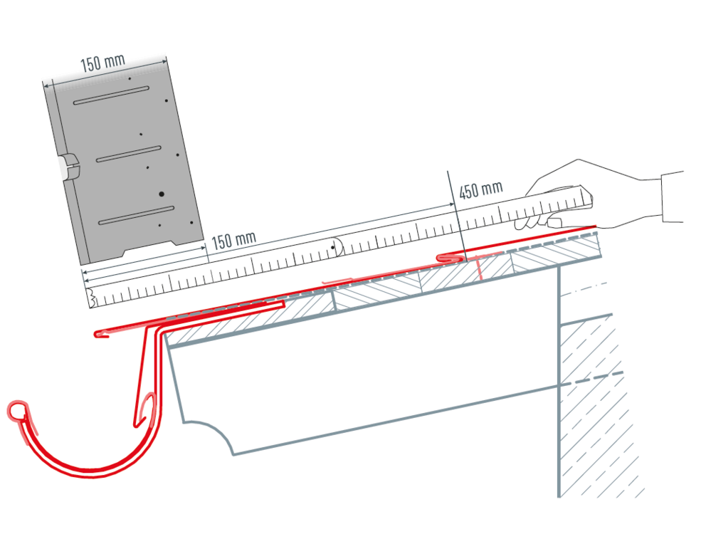 Od planowanej krawędzi górnej pierwszej dachówki klasycznej odmierz 450 mm w kierunku okapu (pamiętaj, że pas powinien wystawać poza okap o 30–80 mm). Od dołu, na wysokości 150 mm (szerokość pasa startowego) zaznacz punkt wyznaczający górną krawędź pasa startowego.