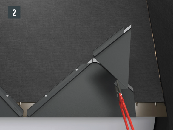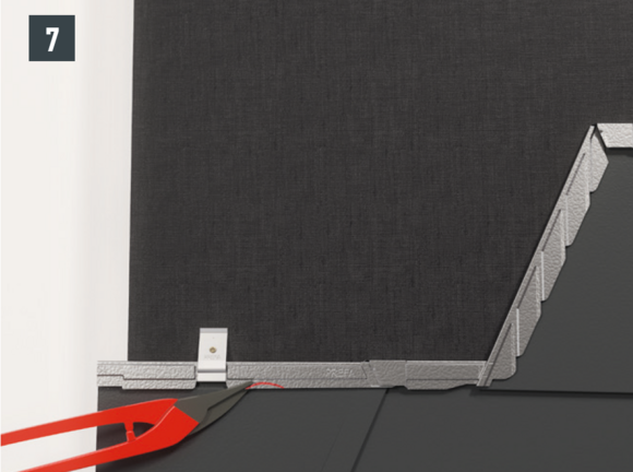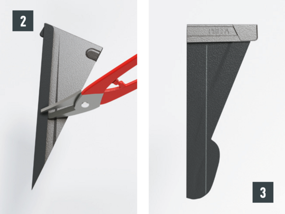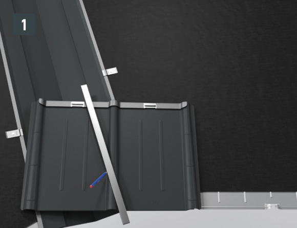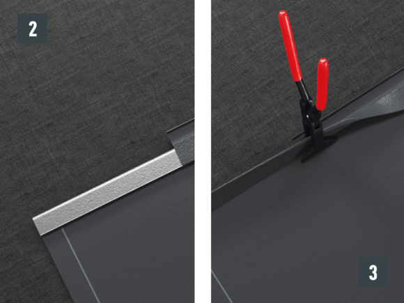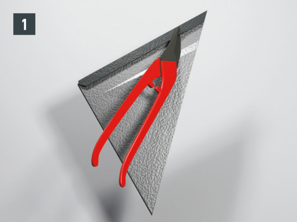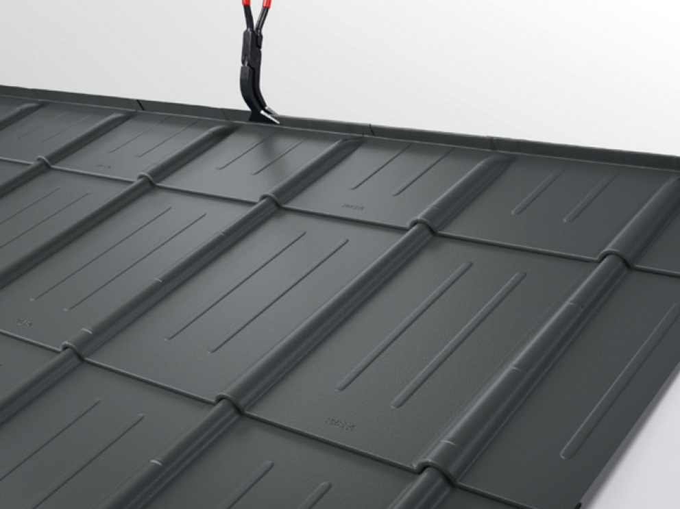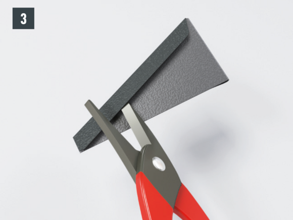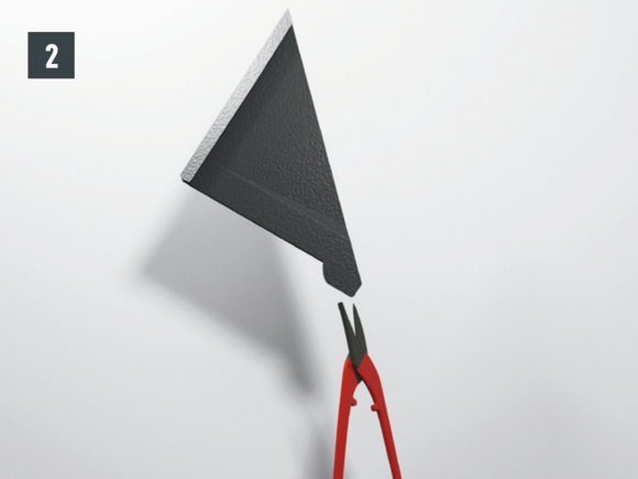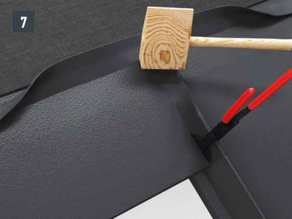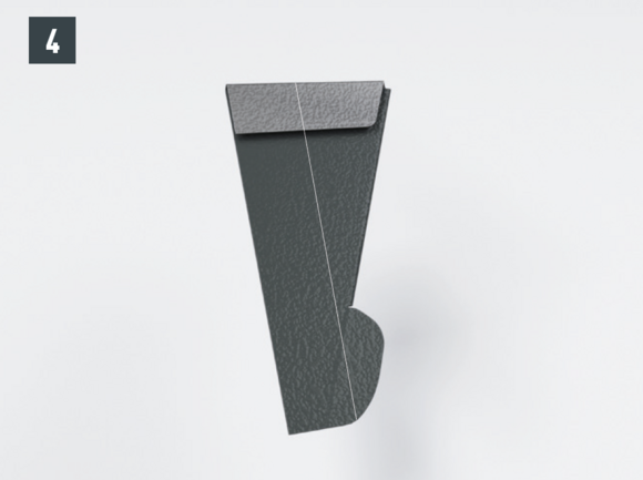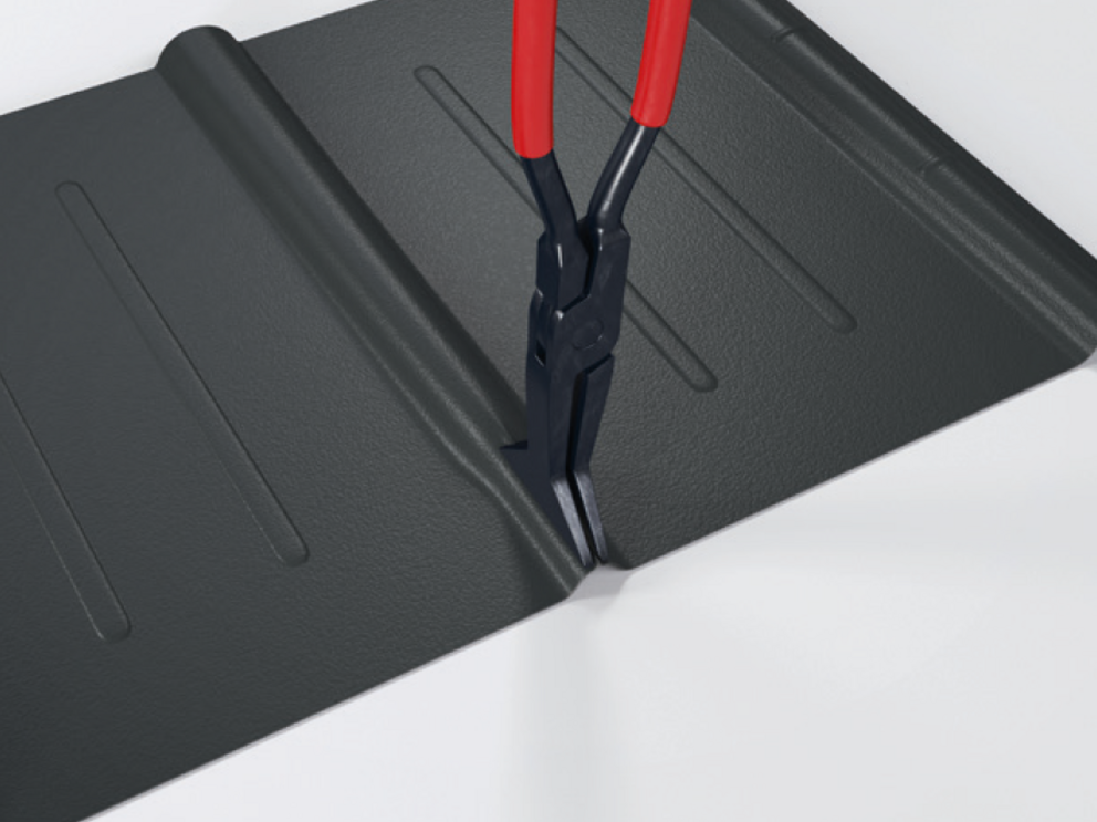 Po docięciu dachówki klasycznej wykonaj zagięcie na żłobku środkowym, aby utworzyć rąbek zaczepowy. Zagięcie można wykonać cęgami do falcowania lub za pomocą żłobiarki.