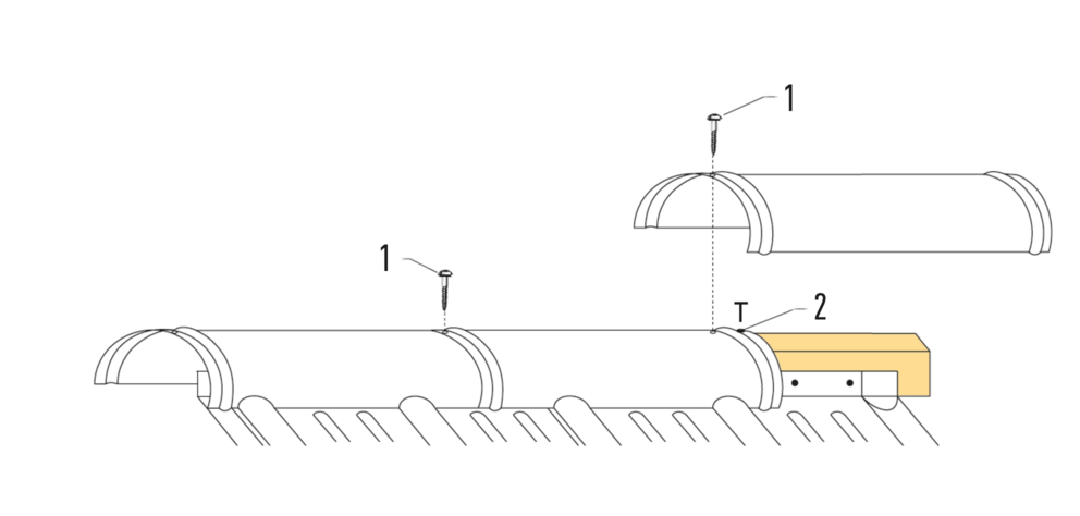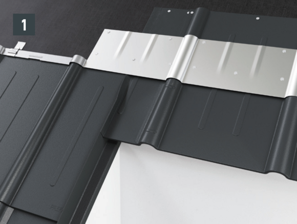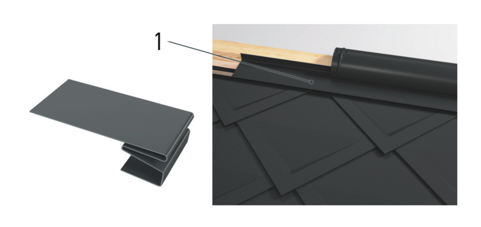 Pomiędzy dachówkami końcowymi dla rombu 29 × 29 należy zamontować dołączony element (1) maskujący.
