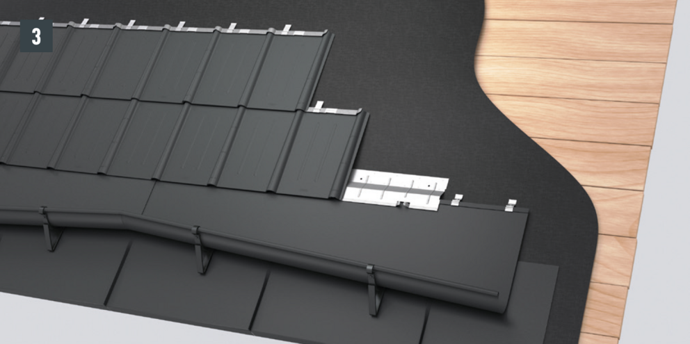 Po przygotowaniu dachówki DS.19 można wykonać wykończeniowe elementy z blachy (np. okładzinę szczytu lub obróbkę kosza na łączeniu dachu i ściany) i połączyć je z pokryciem.