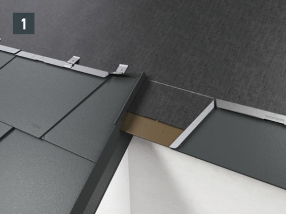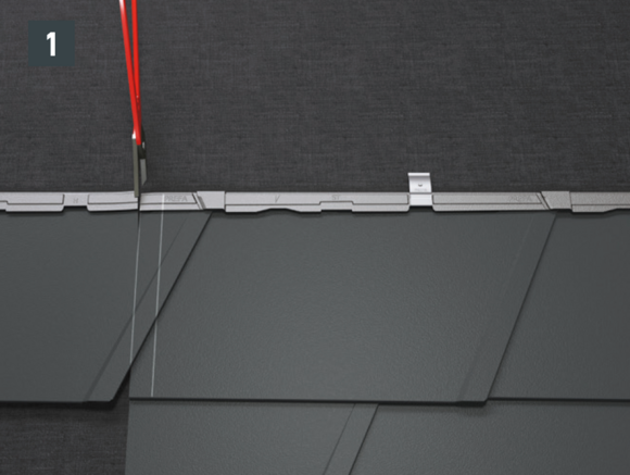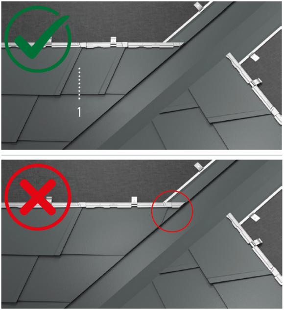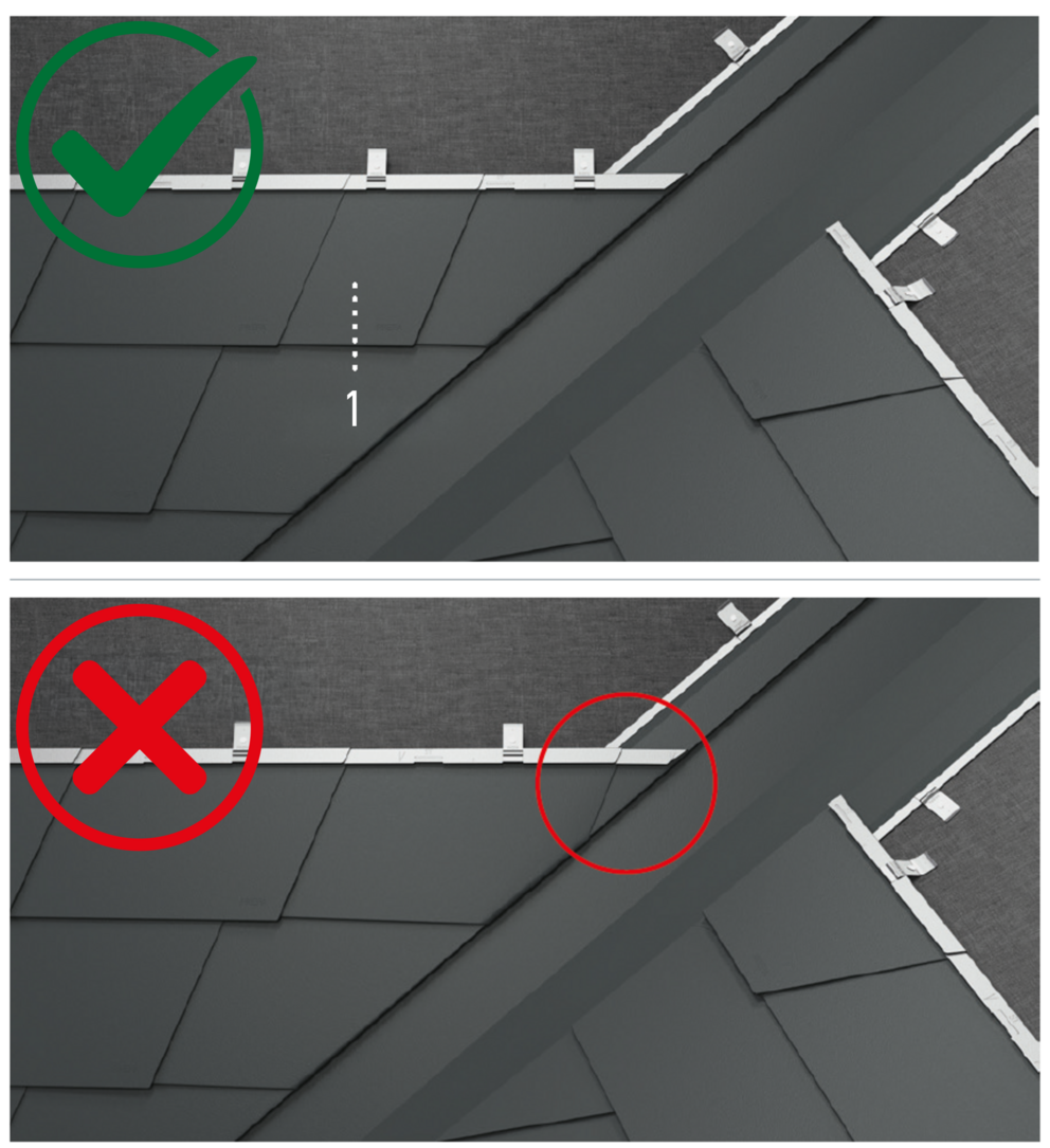 Jeśli punkt przecięcia kosza/styku dachówek zbiega się z lewą krawędzią kosza, należy wcześniej przygotować i zamontować dachówkę skróconą (1) lub dachówkę łupkową długą (1).