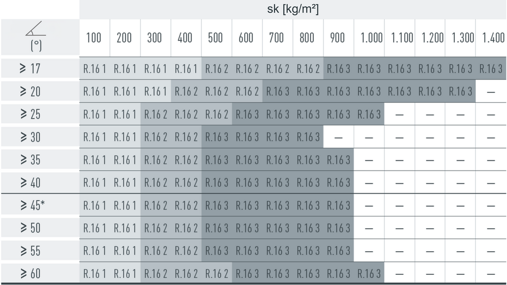 W przypadku dachówki R.16 montuje się 1,7, 3,4 lub 6,8 szt. stoperów śniegowych na m² (patrz tabela poniżej – schemat układania R.16 1, R.16 2 i R.16 3). Pierwsze dwa rzędy muszą zostać na całej długości wyposażone w stopery śniegowe.