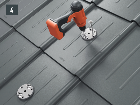 Montaż odbywa się za pomocą dwóch podstaw na pokryciu dachu. Na wspornikach bariery śniegowej do warunków górskich można ułożyć drewniane belki o Ø ok. 140 cm i zamocować je dołączonymi wkrętami. Łączna wysokość wsporników z podstawami: 219 mm. Wsporniki bariery śniegowej do warunków górskich można zamontować także w późniejszym czasie. Jest dostępna we wszystkich kolorach systemów dachowych PREFA (mały format).