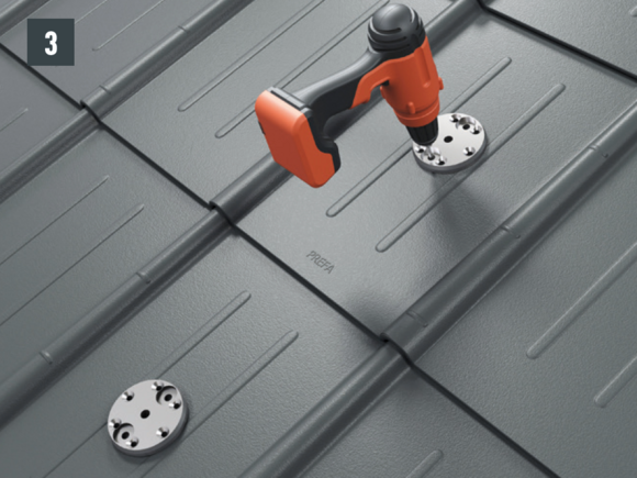 Nie osadzać podstawy na rąbku ani grzbiecie fali pokrycia dachowego PREFA ani nie mocować jej w tych punktach. Nie wykraczać poza wyznaczone powierzchnie montażowe danego produktu dachowego. Konieczne może być zamontowanie elementu podkładowego (np. jeśli w obszarze krokwi znajduje się rąbek lub grzbiet fali).