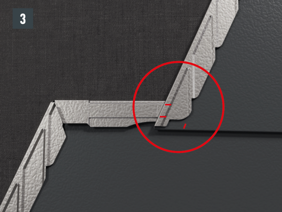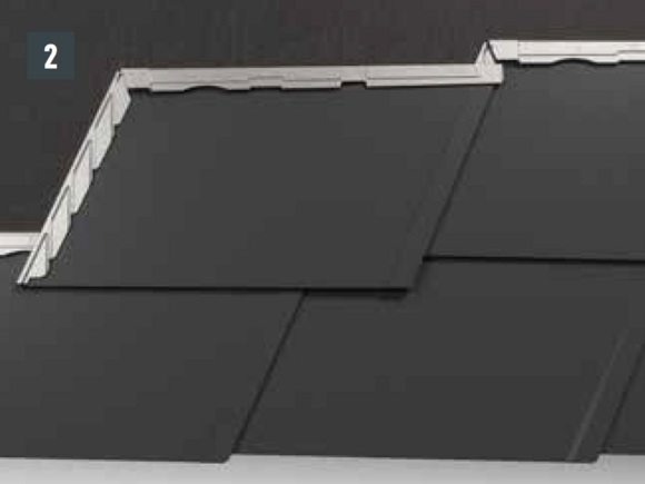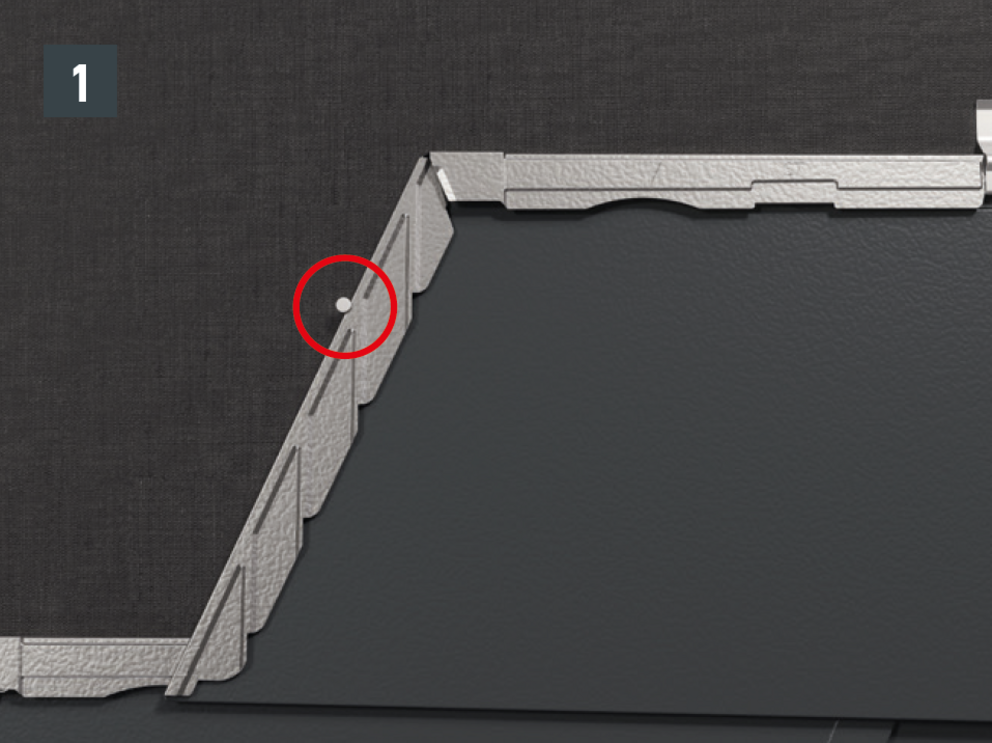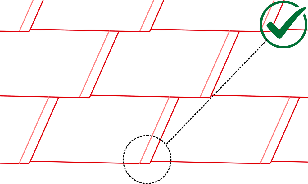 Ze względu na kształt dachówki łupkowej DS.19 w obszarze piętki tworzy się uskok. Należy zachować go także podczas układania pierwszej dachówki DS.19 każdego rzędu, nie wsuwając jej do końca na pas startowy lub w rąbek. Piętkę pierwszej dachówki DS.19 należy obniżyć na tyle, aby górne obrzeże dachówki na całej długości leżało prosto.