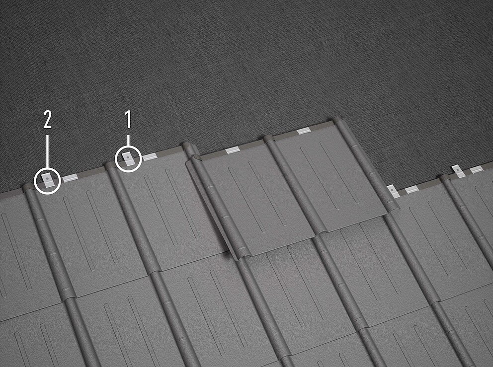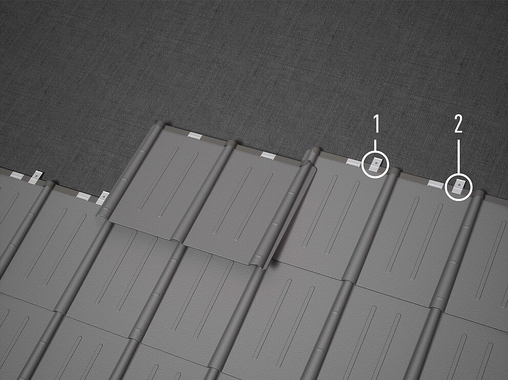 Każdą dachówkę przymocuj dwoma zaczepami systemowymi (standardowe mocowanie). Systemowe zaczepy mocujące są mocowane za pomocą gwoździa 2,8/30 lub 2,8/25. W przypadku zastosowania grubszych warstw rozdzielających należy w razie potrzeby użyć odpowiednio dłuższych gwoździ.