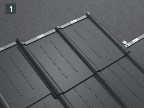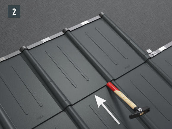 Wcisnąć dachówkę w rąbek leżący. Lekko dobij dolną krawędź dachówki trzonkiem młotka (rys. 2).
