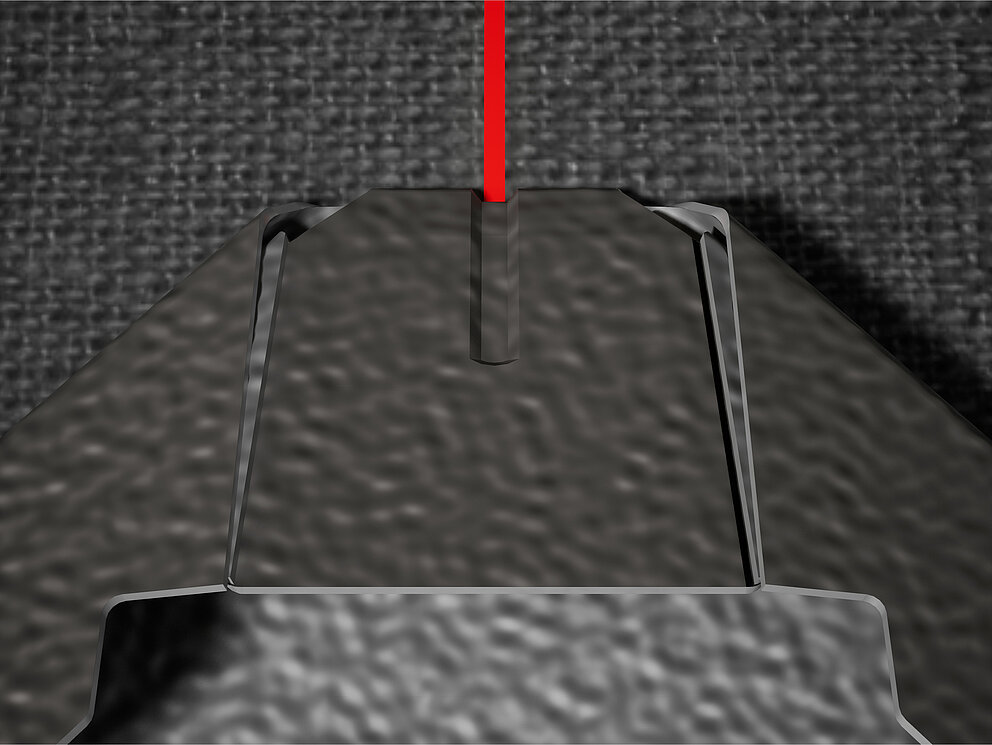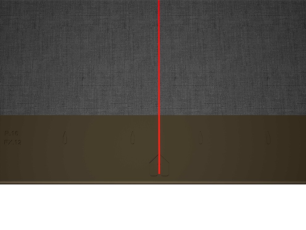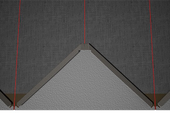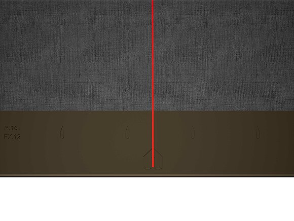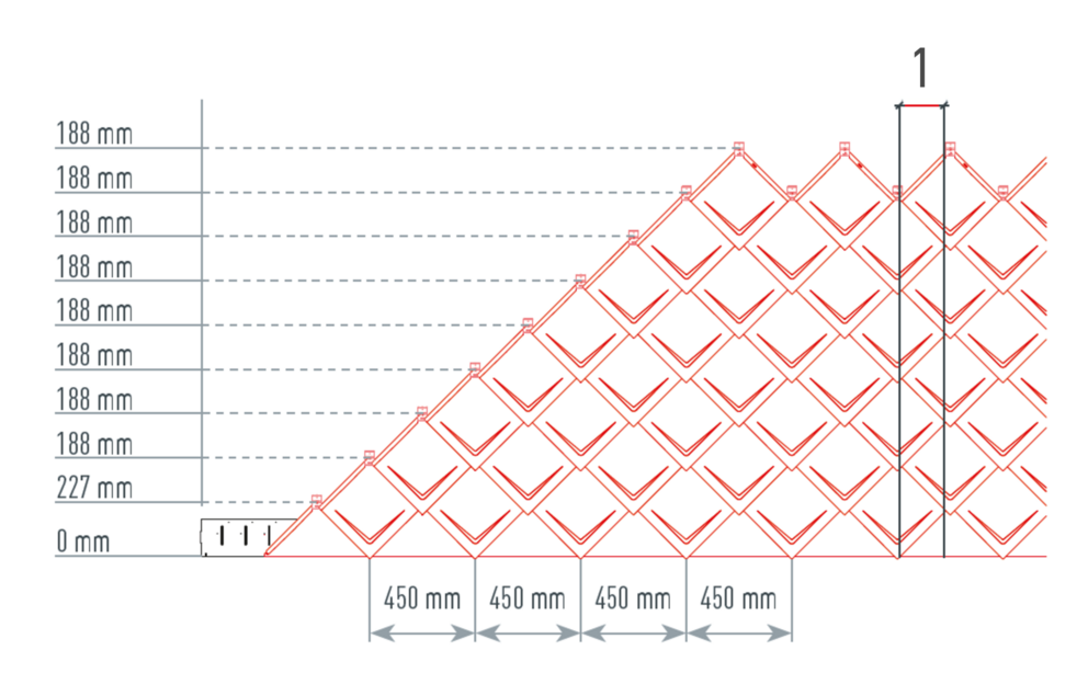 Dla łatwiejszego montażu dachówek romb 29 × 29 PREFA zaleca się naniesienie na połać pionowych linii traserskich w odległości co 450 mm. Aby w każdym rzędzie dokładnie trzymać się tych linii, w razie potrzeby można nanieść także dodatkowe linie pomocnicze w połowie odległości pomiędzy liniami głównymi. Ustawić dachówki początkowe nacięciami (przy górnej krawędzi dachówek początkowych) do prostopadłych linii traserskich (patrz rysunek poniżej). Pamiętaj, że obszar zakończenia bocznego (np. na wykończenie deski szczytowej) nie może leżeć w połowie dachówki romb 29 × 29 (zwracaj uwagę na symetrię/środek połaci).