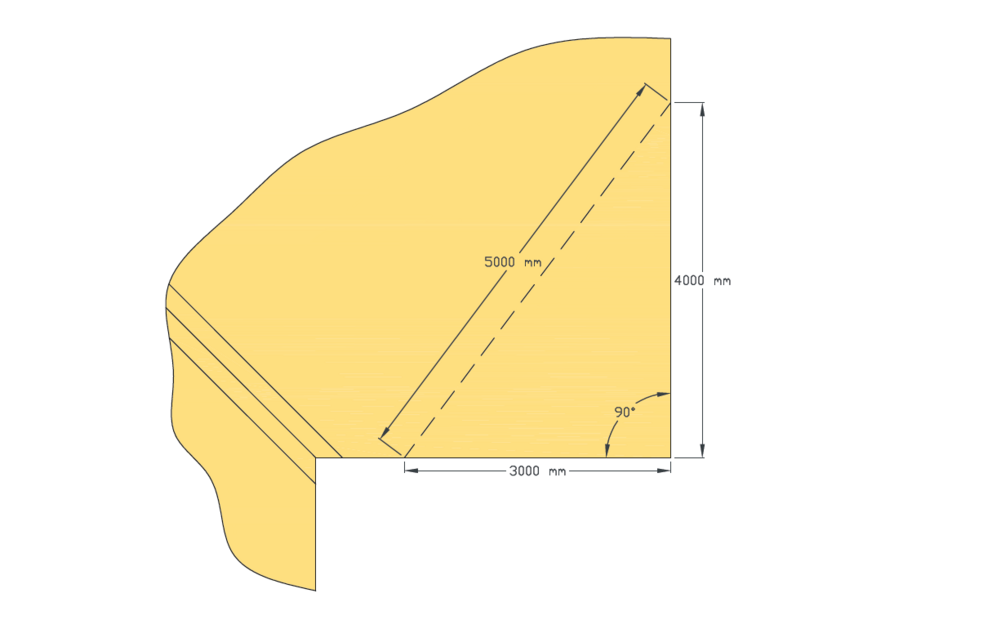 Najpierw zaznaczyć wybrany punkt narożny. Następnie zaznaczyć odległość 3 metrów wzdłuż krawędzi, na której ma zostać utworzony kąt prosty. Następnie odmierzyć w przybliżeniu odcinek 4 m od tego samego punktu narożnego w wybranym kierunku kąta prostego.