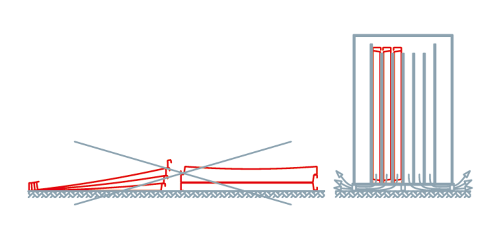 Składowany materiał nie powinien być również narażony na działanie czynników zasadowych (zaprawa murarska, pył wapienny lub cementowy itp.) ani zasadowych lub kwaśnych oparów oraz soli (np. soli drogowej).