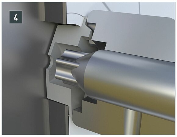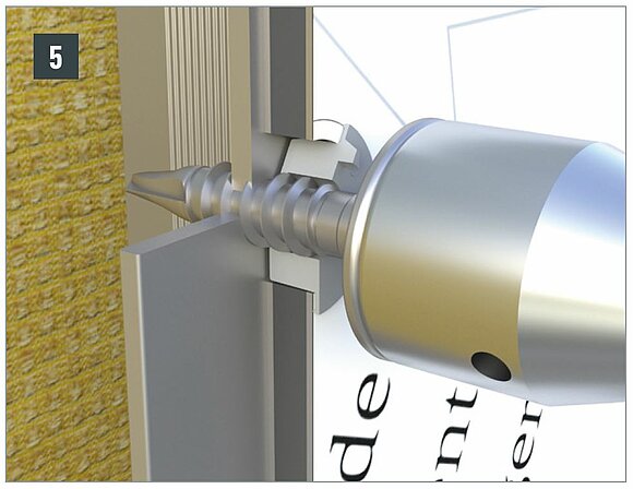 Średnica otworów w punktach mocowania wynosi zawsze ⌀ 9,5 mm, niezależnie od tego, czy jest to punkt stały, czy przesuwny. Podkonstrukcja drewniana jest wstępnie nawiercana za pomocą kabłąka przyrządu wiertarskiego do podkonstrukcji drewnianej ⌀ 9,5 mm na ⌀ 3,3 mm, aby umożliwić prostopadłe i centryczne wkręcanie śruby oraz zapobiec wyłamaniu kantówki. Następnie wcisnąć do każdego otworu centrujący pierścień uszczelniający, niezależnie od tego, czy jest to punkt stały czy przesuwny.