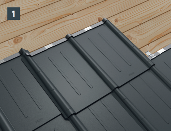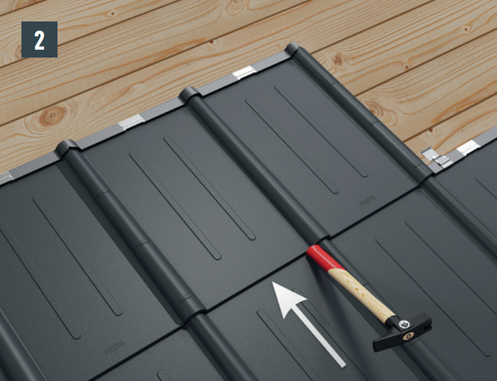 Wcisnąć dachówkę w rąbek leżący. Lekko dobij dolną krawędź dachówki trzonkiem młotka (rys. 2).