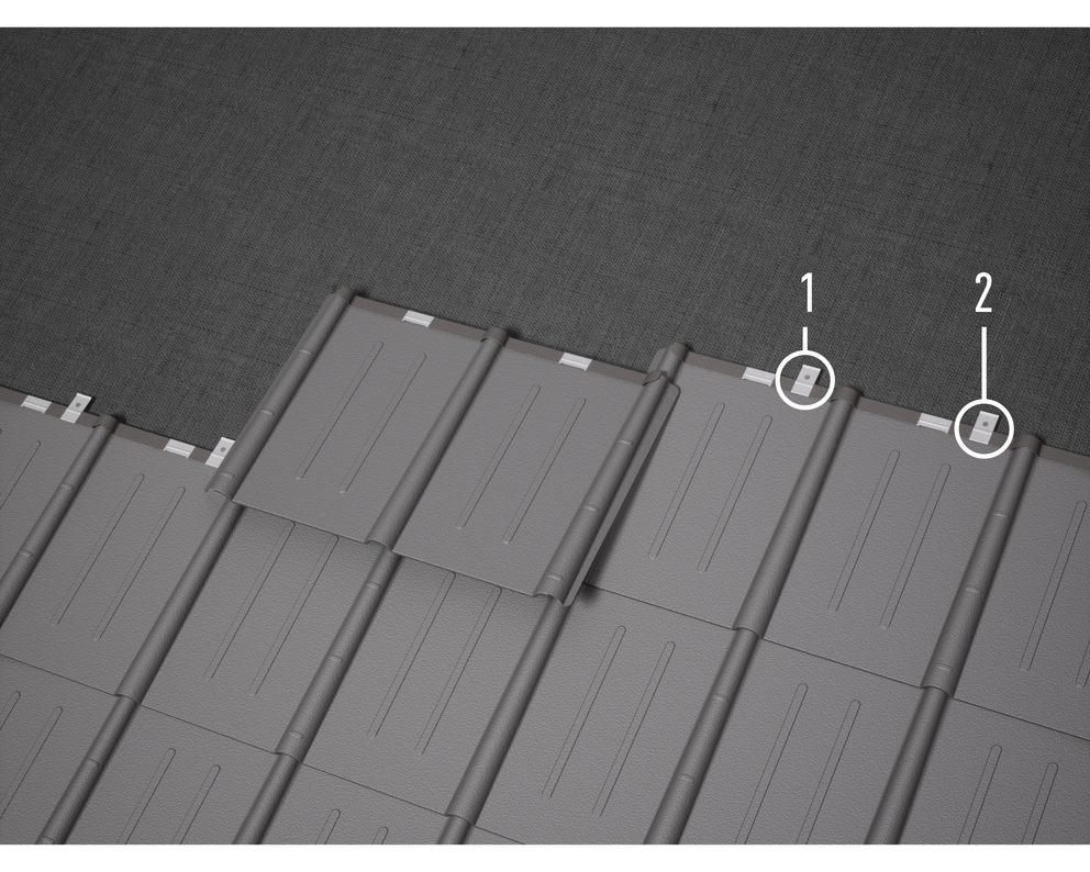 Zaczepy należy umieszczać w odległości ok. 3 cm od rowka płyty. Na terenach, gdzie występują szczególnie silne wiatry, konieczne jest obliczenie obciążenia wiatrem i wzmocnienie mocowania stosownie do wyniku obliczeń bądź zastąpienie gwoździ wkrętami. Jeśli mocowanie przy użyciu zwiększonej liczby zaczepów nadal nie spełnia wymagań określonych na podstawie obliczeń, można dodatkowo założyć bezpośrednie mocowanie na wylocie fali (dolna fala) za pomocą 2 śrub SPAX na każdą dachówkę.