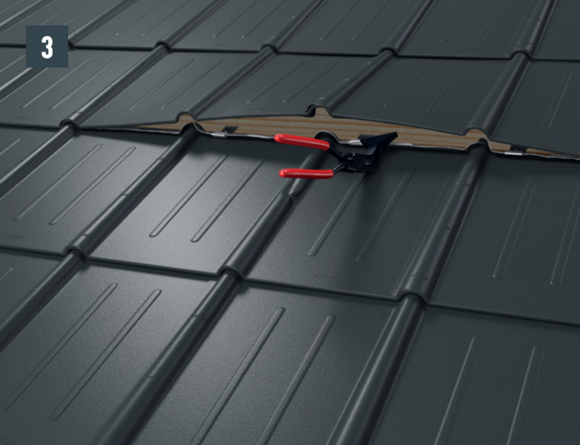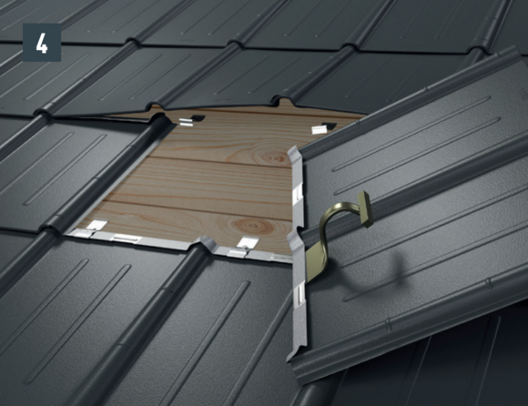 • Otwórz nieco górny rąbek nowej dachówki, aby umożliwić wsunięcie zaczepów tudzież wczepienie nowej dachówki (rys. 4).