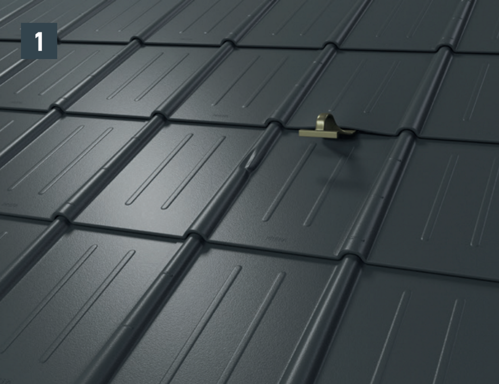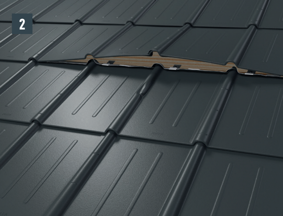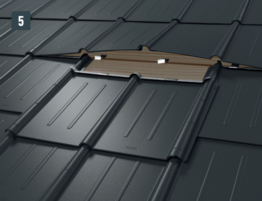 • Przed wsunięciem nowej dachówki przymocować oba żłobki zewnętrzne i otworzyć nieco górny rąbek. Oboma bocznymi żłobkami nowej dachówki można nakryć drugą dachówkę (rys. 5).