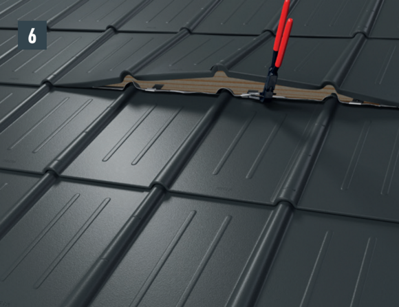 • Unieś rąbek i ponownie zahacz oba zaczepy. Zagnij rąbek górnej dachówki do dołu pod kątem ok. 90° (rys. 6).