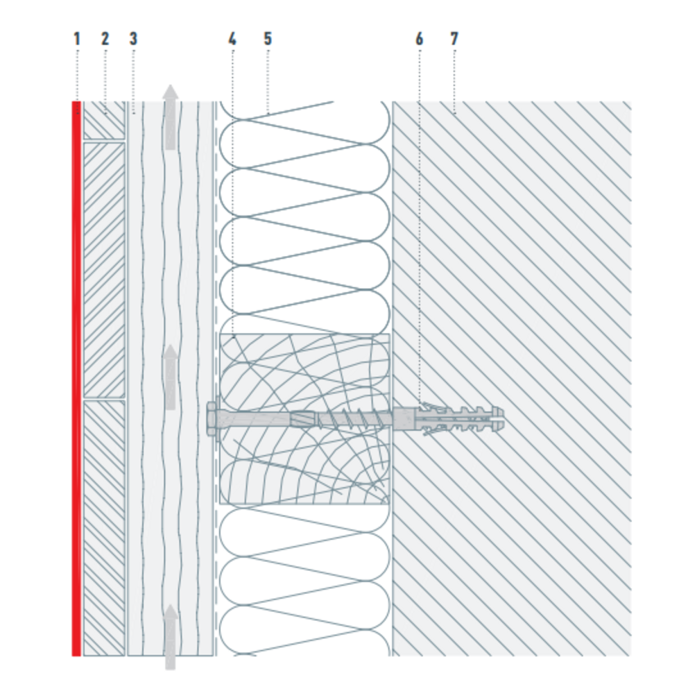 W zależności od materiału wybranego dla konstrukcji nośnej szczelina wentylacyjna z tyłu musi odpowiadać obowiązującym krajowym wymaganiom. W celu zapewnienia swobodnego przepływu w płaszczyźnie wentylacji od tyłu profile nośne muszą być ustawione pionowo. Zamontowane na nich pełne deskowanie musi być wykonane poziomo.