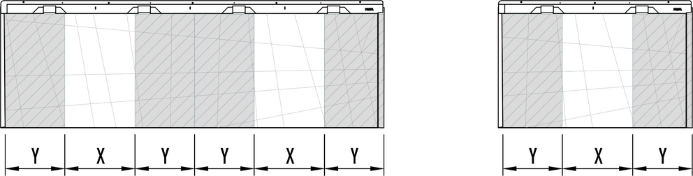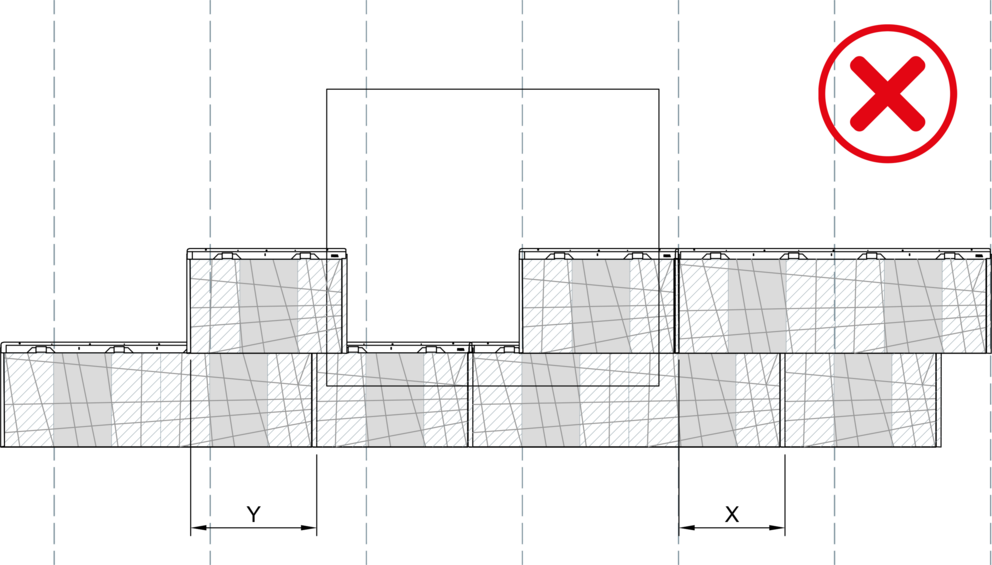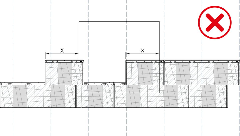 W przypadku układania paneli elewacyjnych FX.12 rąbki kątowe nigdy nie mogą leżeć bezpośrednio jeden pod drugim. Należy zachować przesunięcie boczne wynoszące co najmniej 220 mm. W przypadku mieszania dużych i małych paneli FX.12 w każdym nowym rzędzie styk pierwszego panelu musi zaczynać się w strefie „X”.