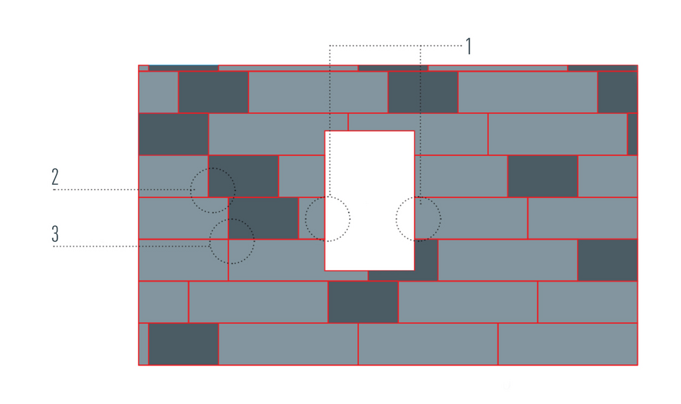 Odcięta część panelu FX.12 została wykorzystana po drugiej stronie otworu (1). Zakłóca to poprawny układ styków paneli (2) i w najgorszym razie może prowadzić do zbiegu linii styku (3). Dlatego opracowano przykłady montażu z optymalnym przesunięciem.
