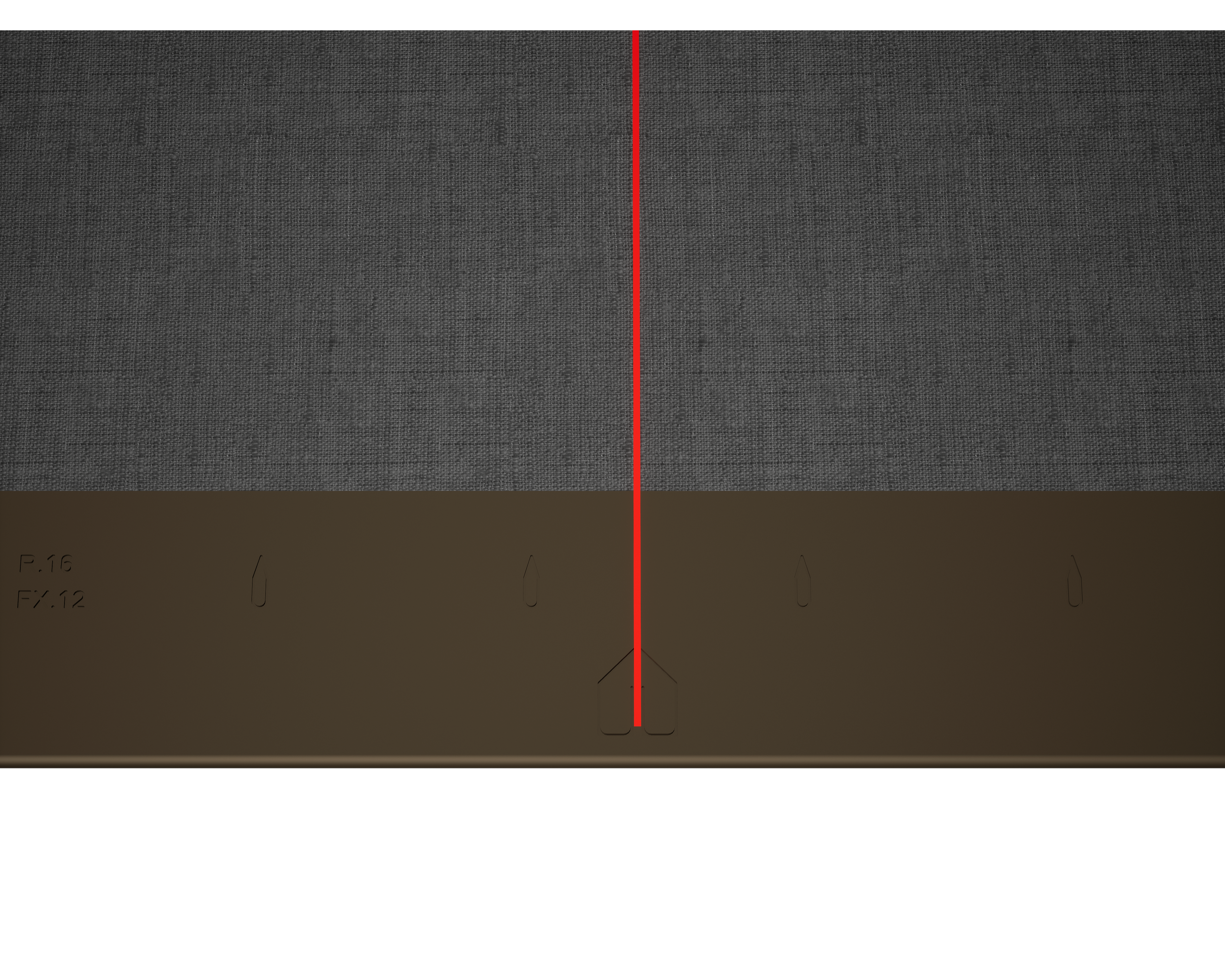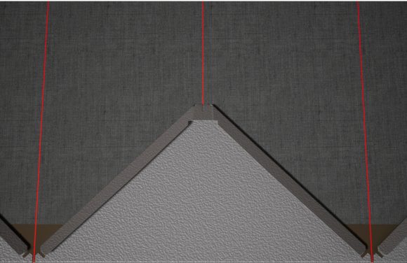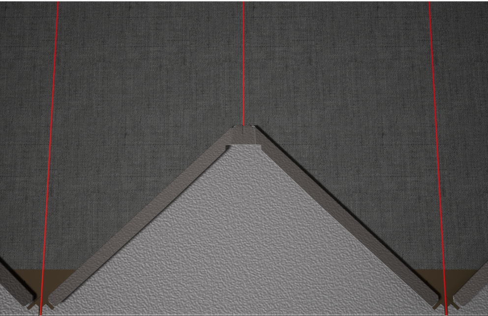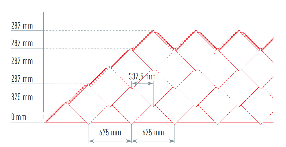 Dla łatwiejszego montażu rombów elewacyjnych 44 × 44 PREFA zaleca się naniesienie na połać pionowych linii traserskich w odległości co 675 mm (oznaczenia na pasie startowym służą jako punkt orientacyjny). Aby w każdym rzędzie dokładnie trzymać się tych linii, w razie potrzeby można nanieść także dodatkowe linie pomocnicze w połowie odległości pomiędzy liniami głównymi. Ustawić dachówki początkowe nacięciami (przy górnej krawędzi dachówek początkowych) do prostopadłych linii traserskich (patrz rysunek poniżej). Zwrócić przy tym uwagę, aby obszar zakończenia bocznego (np. zakończenie boczne lub narożniki budynku) nie był umieszczony w środku rombów elewacyjnych 44×44 (zwrócić uwagę na symetrię powierzchni elewacji).