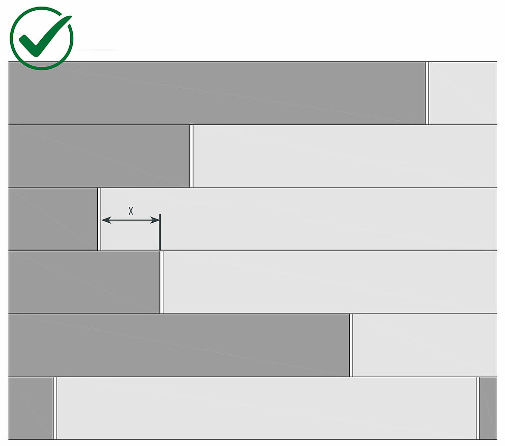 Firma PREFA zaleca, aby przesunięcie (x) było równe co najmniej odległości odpowiadającej zamontowanej szerokości konstrukcyjnej (SK) (np. dla sidingu 138 × 0,7 mm = min. przesunięcie 138 mm):