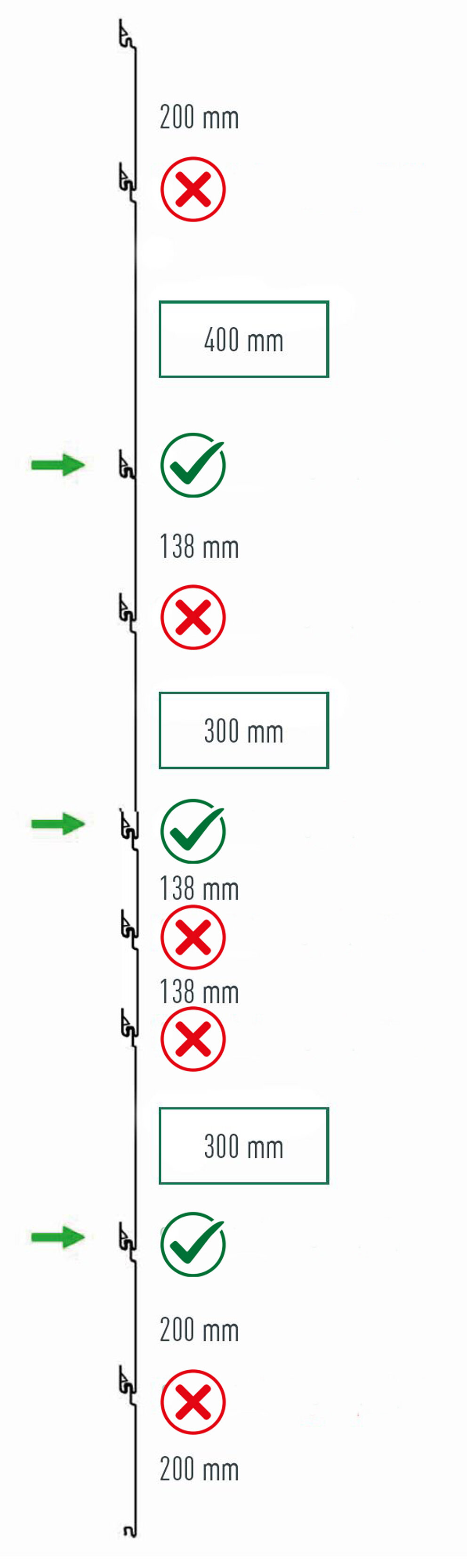 Klipsy do zabezpieczeń burzowych muszą być zamontowane we wszystkich punktach mocowania przy następującej kombinacji grubości materiału i szerokości konstrukcyjnej (każdy profil sidingu musi być przymocowany do co najmniej dwóch profili konstrukcji nośnej).