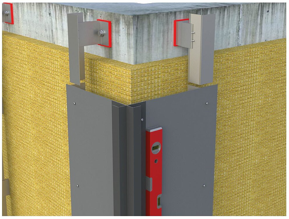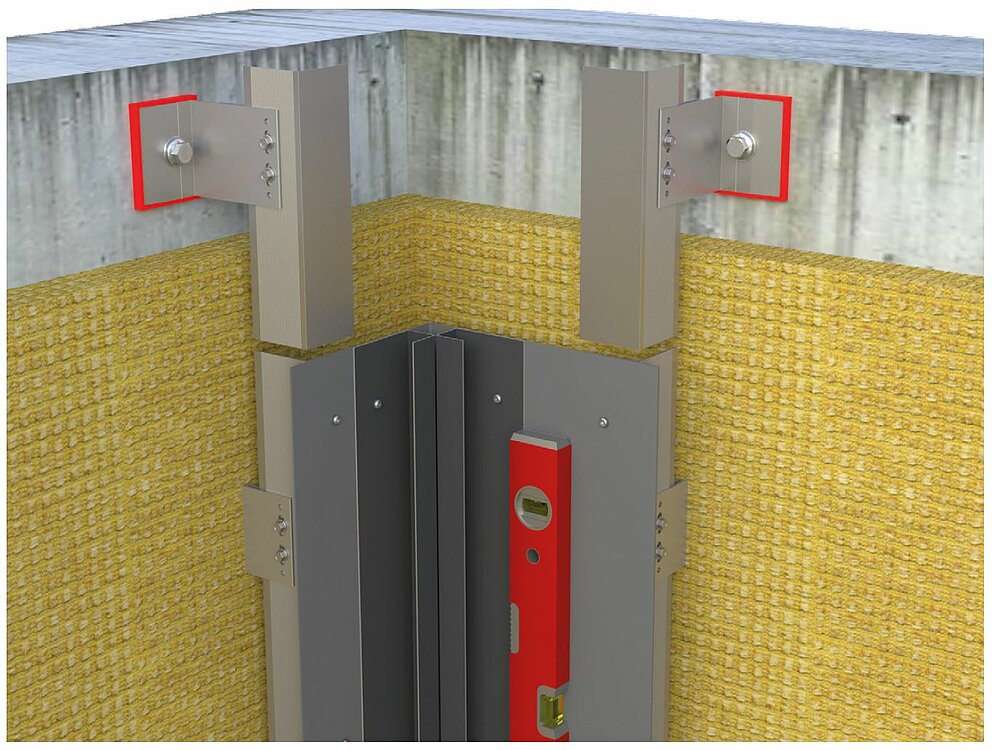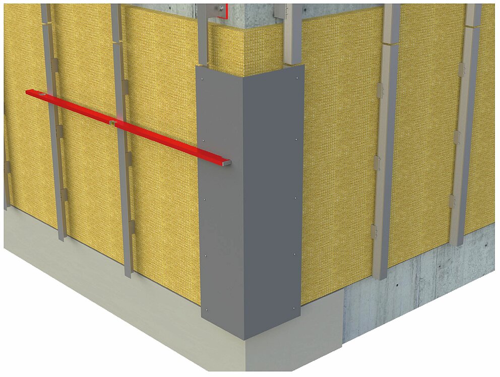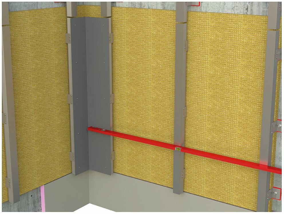 Należy przygotować do montażu narożnika wewnętrznego lub zewnętrznego konstrukcję nośną do poziomego układania profili. Aby zamontować profile narożne wewnętrzne lub zewnętrzne, należy najpierw połączyć pionową konstrukcję nośną ze wspornikiem z blachy aluminiowej w arkuszach o grubości 2 mm lub blachy stalowej ocynkowanej (1 mm). Należy uwzględnić to już podczas montażu konstrukcji nośnej, przesuwając profile nośne dalej do wewnątrz o grubość materiału wspornika, w celu zapewnienia płaskości konstrukcji nośnej.