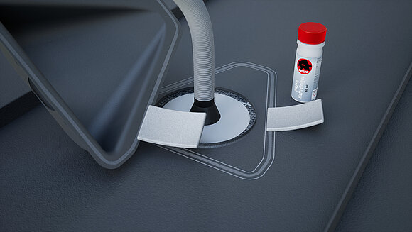 Nałożyć klej specjalny na obwodzie i przeprowadzić wąż falisty przez tuleję. Następnie nałożyć przepust do kabli instalacji słonecznej i docisnąć na środku.