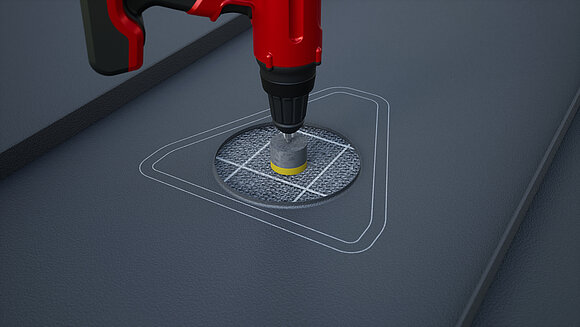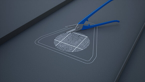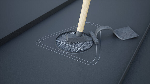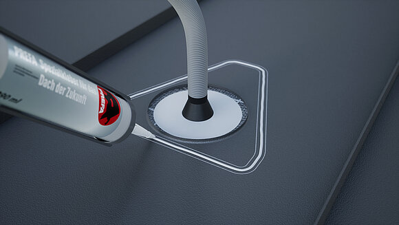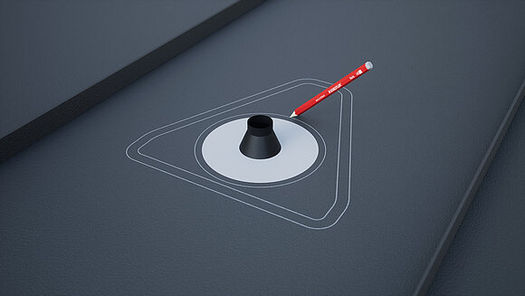 Ustawić przepust do kabli instalacji słonecznej i zaznaczyć jego obrys. Następnie zaznaczyć powierzchnię klejenia (25 mm) oraz wycięcie na kołnierz rurowy. Wyciąć i zagiąć krawędzie okrągłego obszaru.