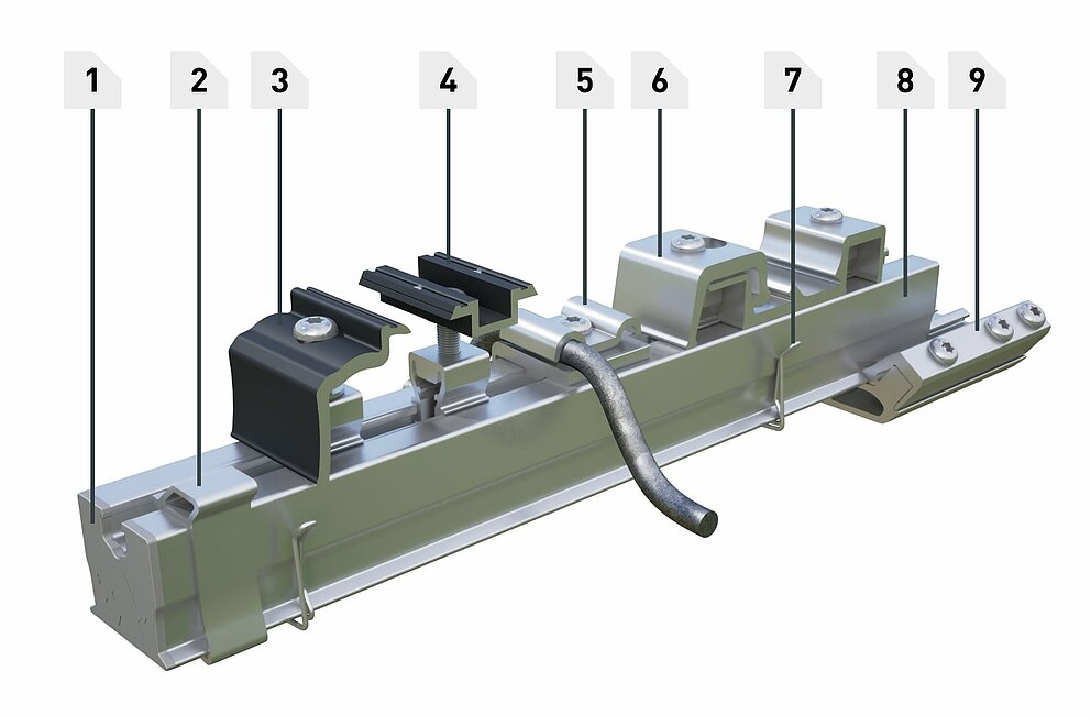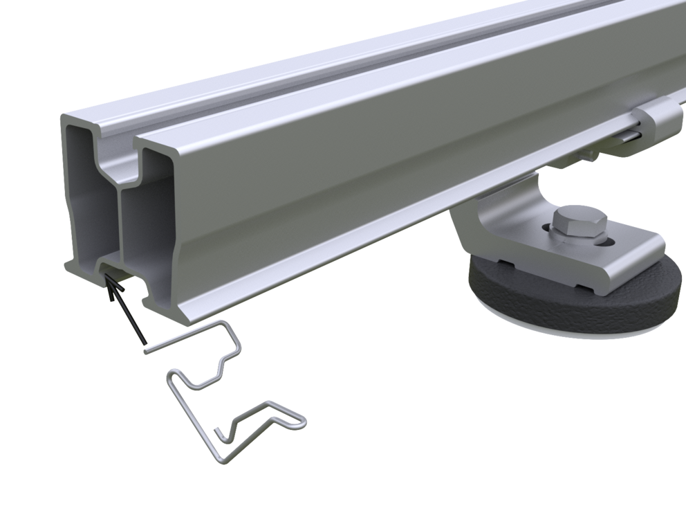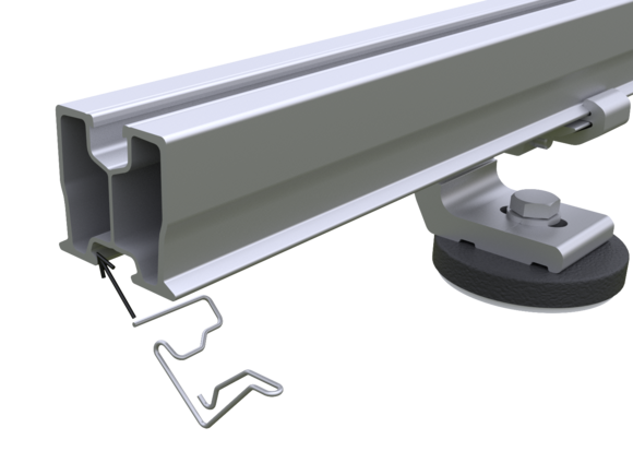 Aby zapobiec spadaniu modułów fotowoltaicznych, w systemie montażowym do instalacji solarnej PREVARIO montuje się śruby zabezpieczające moduł. W najniższym rzędzie modułów na polu generatora zaciska się po dwie śruby zabezpieczające moduł na górnej szynie każdego modułu. W przypadku zsunięcia się modułu, górna krawędź jego ramy zaczepi się o śruby zabezpieczające. Śruby podtrzymujące osuwający się moduł nie zapewniają trwałego mocowania modułu. Należy natychmiast ponownie zamontować moduły, których to dotyczy.