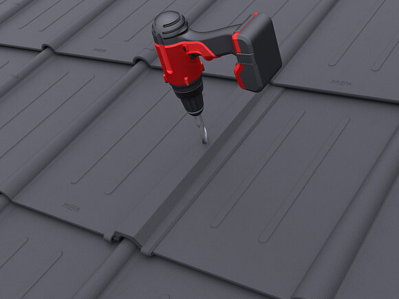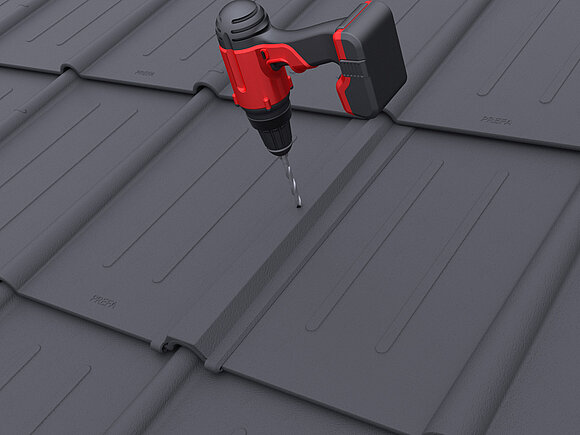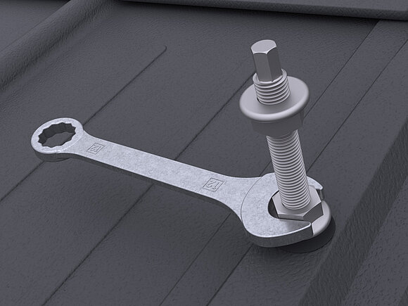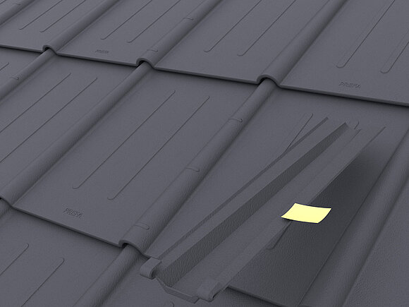 Jeżeli dokładnie nad krokwią (w obszarze montażu śruby dwugwintowej) znajduje się zakładka lub rowek środkowy dachówki, wówczas zamiast blachy podkładowej można zastosować wspornik specjalny panelu słonecznego Sunny.