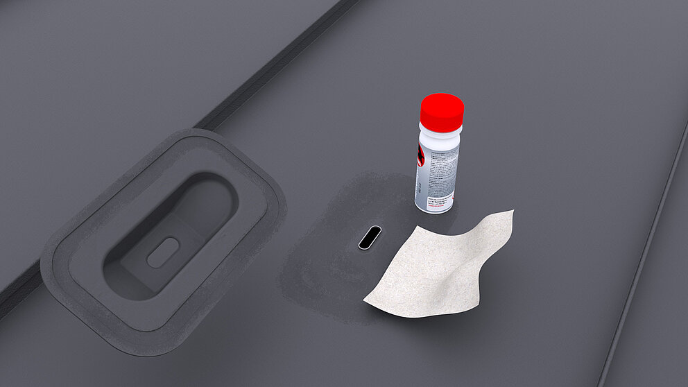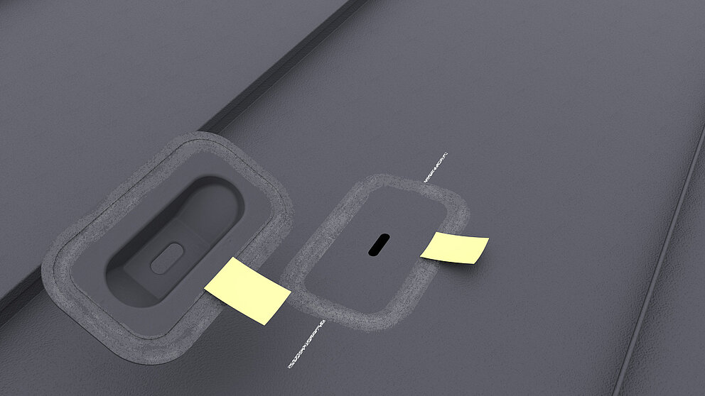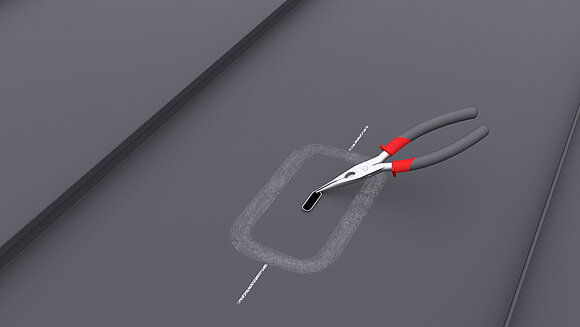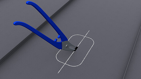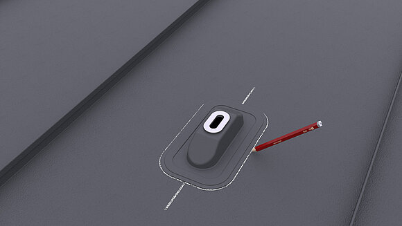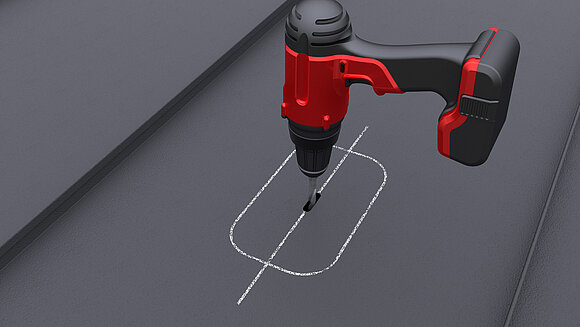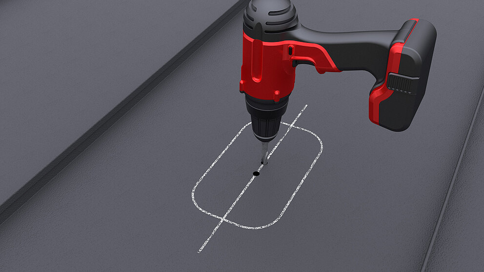 Odrysować kontur i zaznaczyć podłużny otwór. Wywiercić podłużny otwór (⌀ 13 mm) w taśmie PREFALZ (wielkość nawierconego otworu wystarczająca dla produktów małoformatowych). Wyciąć podłużny otwór w taśmie PREFALZ (nie jest to konieczne w przypadku produktów małoformatowych).