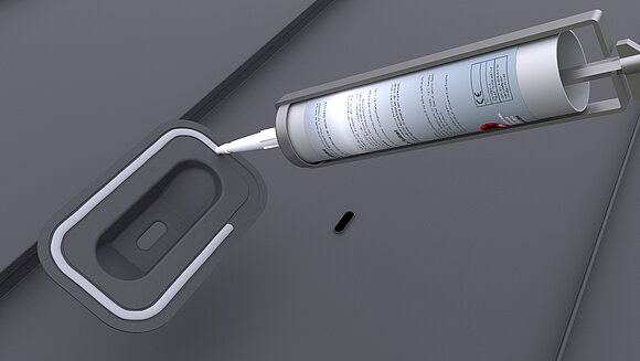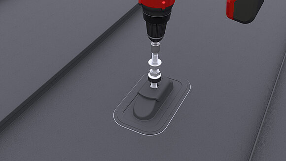 Element dachowy i PREVARIO Sunny przeszlifować w miejscach klejenia. Wygiąć na zewnątrz krawędzie podłużnego lub nawierconego otworu. Przeszlifowaną powierzchnię oczyścić środkiem do czyszczenia. Na przeszlifowany i oczyszczony wspornik Sunny nanieść pasek kleju (⌀ 10 mm). Następnie docisnąć PREVARIO Sunny, naciskając na jego środek. Założyć kalotę wkręcić śrubę dwugwintową wiertarką (nakładka klucza nasadowego SW 9 mm). Głębokość wnikania w konstrukcję nośną (krokwie): min. 80 mm.